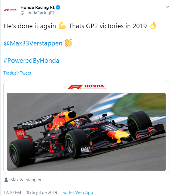 A vitória em Hockenheim no GP da Alemanha foi a segunda de Verstappen e da Red Bull na temporada. A equipe austríaca trabalha esse ano com motores Honda, que foram fortemente criticados por Fernando Alonso quando o espanhol pilotava a McLaren. A fornecedora japonesa não perdeu a oportunidade para alfinetar o campeão mundial da categoria.