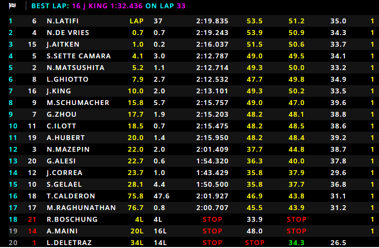 Faltando três voltas para o final da corrida o safety car entrou na pista devido a um problema com o motor do carro de Boschung, permanecendo até o fim da corrida. Por não respeitar o limite de velocidade do Virtual Safety Car lá no meio da corrida, King e Ghiotto receberam punição de cinco segundos cada, favorecendo o brasileiro que assumiu a quarta colocação.