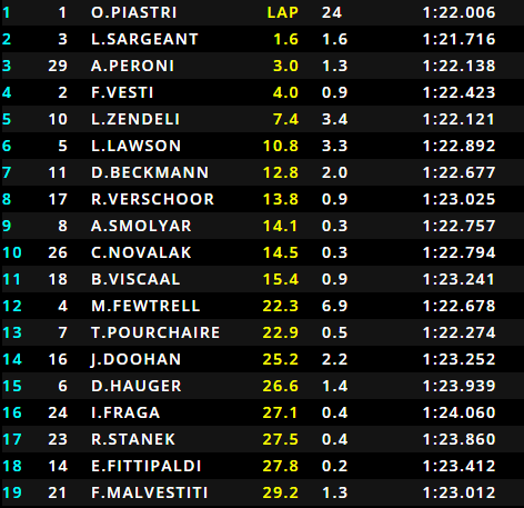 O pole position Fernandez teve um toque logo na primeira curva, acabou rodando e abandonando a prova, deixando a liderança com Piastri. Igor Fraga e Enzo Fittipaldi, que tiveram problemas na classificação e ocuparam as duas últimas posições do grid, largaram bem ganhando, respectivamente, 9 e 7 posições na primeira volta. Com uma corrida de recuperação, foram escalando o pelotão ganhando diversas posições.