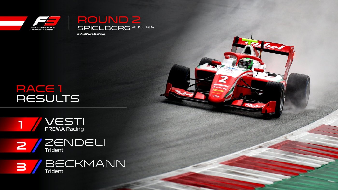 Conforme era previsto a chuva apareceu neste sábado, 11, em Spielberg na Áustria. Com uma tempestade caindo, a primeira corrida do GP da Estíria precisou ser encerrada, com Frederick Vesti saindo vencedor, seguido por Zendelli e Beckmann.